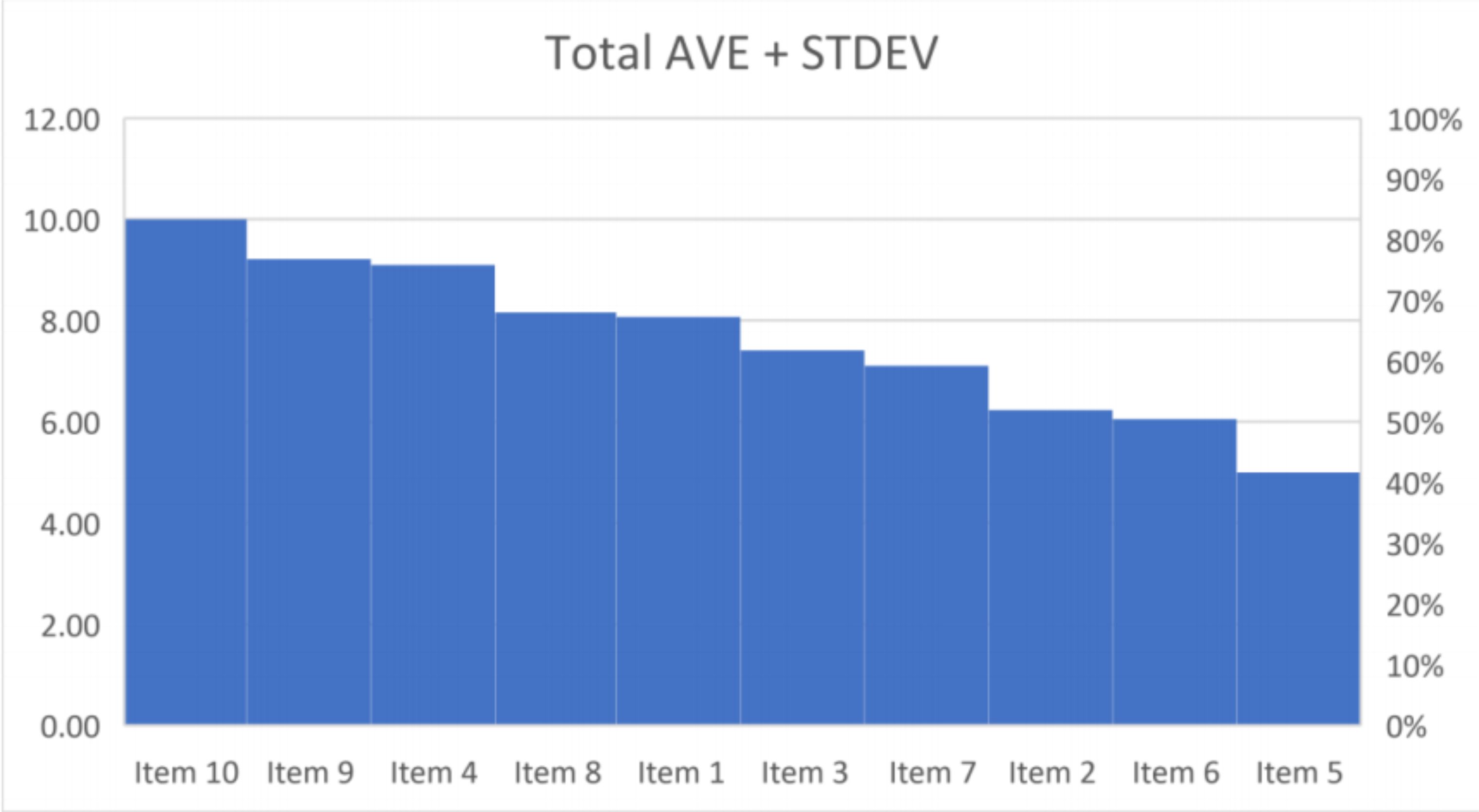 AVESTDEV Rank order budgeting is ranking budget items via their average rank plus their standard deviation times a multiplier to adjust the relative importance of the standard deviation relative to the average in the rankings (AVESTDEV = ()). For the sake of simplicity in this paper the multiplier is set to one to 1. What this equation does is rank items via average priority number and then de-rank them based on their standard deviation. In a congressional budget, items that are controversial will have a larger standard deviation and will be bumped down the list. Items that are largely agreed upon with be moved up the list. Items that are ranked with a low rank high priority number like 1 are moved up the list and items with a high rank low priority number are moved down the list.
