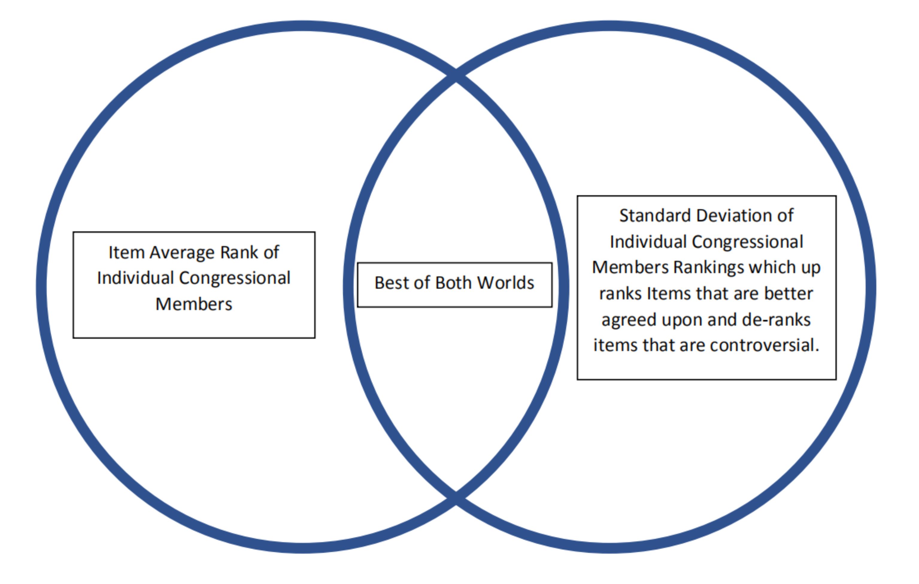 The purpose of this type of budgeting is to pass a budget of the highest ranked and least controversial items in order to avoid a government shutdown on these items and to leave the low ranked and controversial items for a secondary budget fight. It also allows us to observe the values of our congress people by assessing how they ranked items. Is military spending more important than law enforcement? Is the environment more important than social welfare spending? And it allows us to measure exactly how controversial items are in congress with the standard deviation. Some of the things people might think are controversial may not be and vice versa.