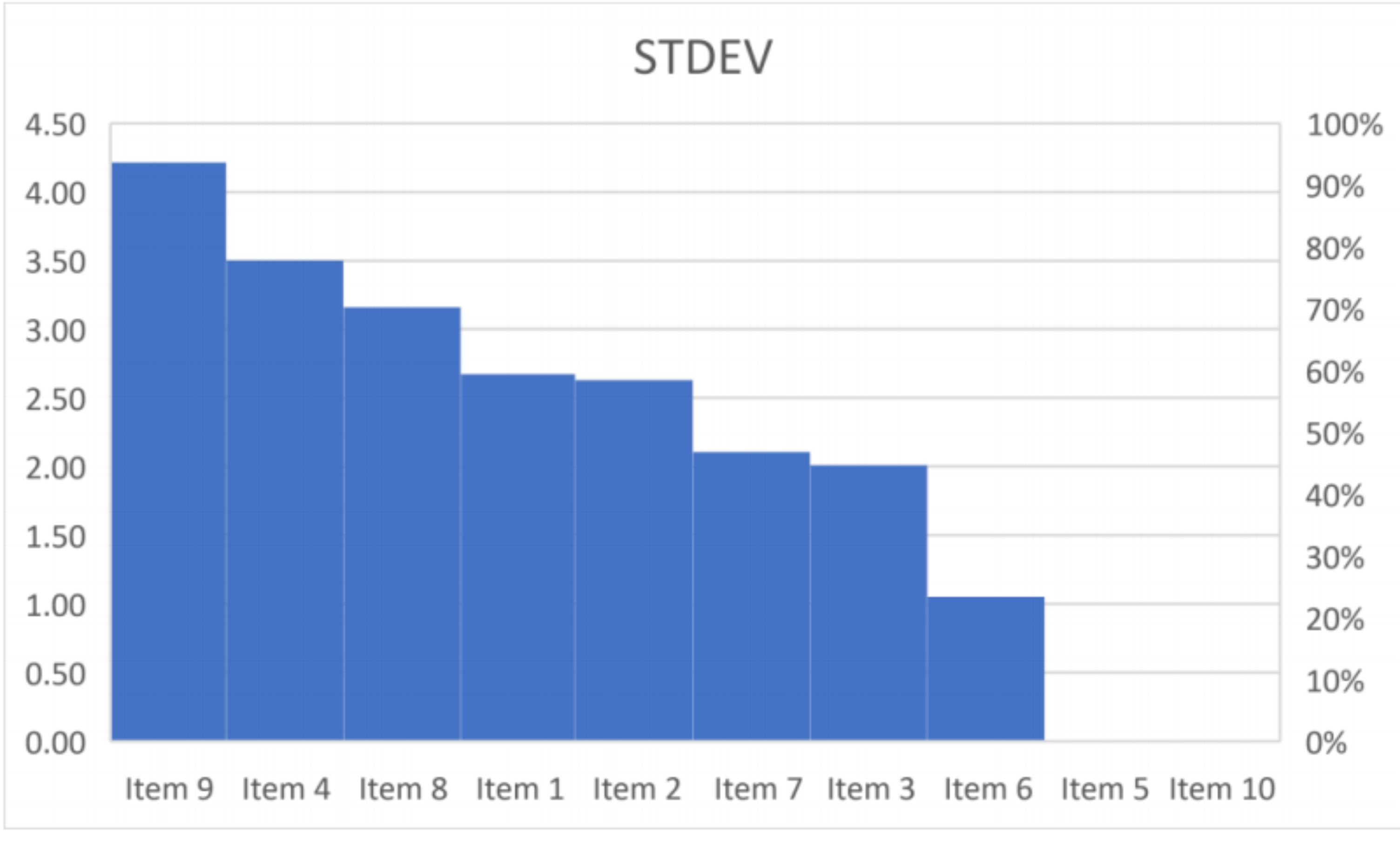 Standard deviation is a measure of how far apart the data points from the mean and a measure of how controversial the item is. If Item 10 is funding for ISIS and item 9 is Border Wall or Abortion funding, item 10 ISIS funding may get funded if standard deviation is the only determiner of rank even though it is last on everyone’s list while Border Wall or Abortion funding wouldn’t have a chance because it is controversial even if it had enough votes to pass.